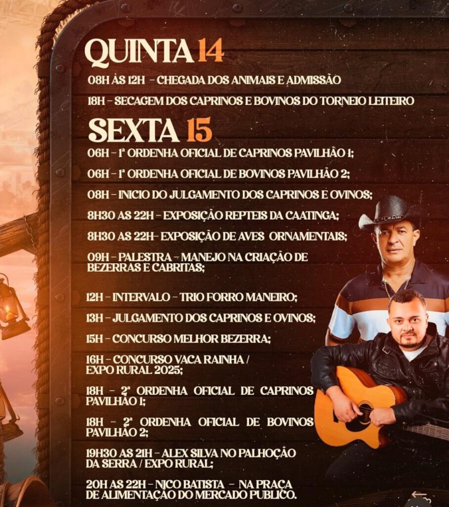 Na sexta-feira (15), a programação começa cedo, às 6h, com as primeiras ordenhas oficiais de caprinos e bovinos. O dia contará ainda com julgamentos de animais, exposições de répteis e aves ornamentais, palestras sobre manejo, concursos como o Melhor Bezerra e a Vaca Rainha, além de shows com Alex Silva e Nico Batista.