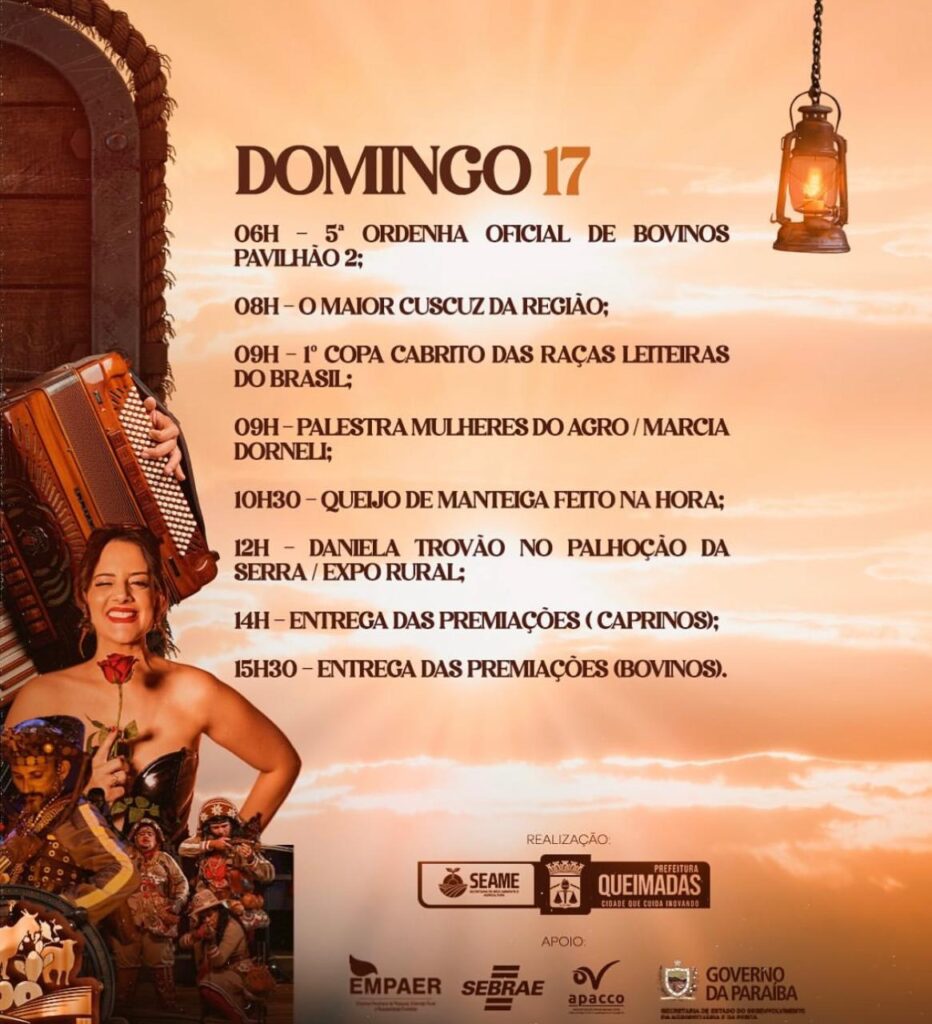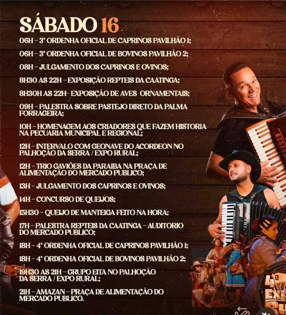 O sábado (16) terá ordenhas, julgamentos, concurso de queijos, homenagem a criadores, palestra sobre pastejo direto da palma forrageira e apresentações culturais com Geovane do Acordeon, Trio Gaviões da Paraíba, Grupo Eta e Amazan.