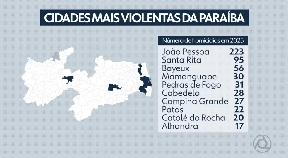Dados do Ministério da Justiça, em 2025, mostram que a Paraíba registrou 900 homicídios no período, e Santa Rita foi a segunda cidade com mais registros de casos no estado, somente atrás de João Pessoa. 446 homicídos desse total se concentram em cidades da Grande João Pessoa. Veja abaixo a lista completa.