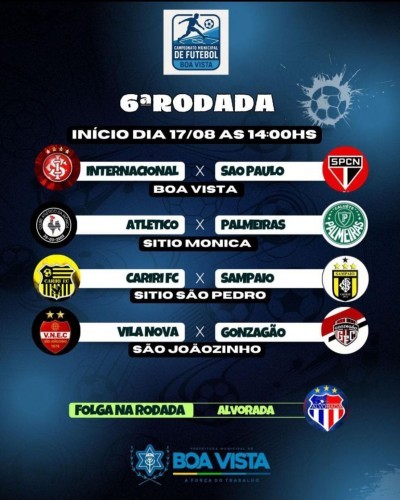 A Prefeitura de Boa Vista segue movimentando o esporte amador do município com a realização do Campeonato Municipal de Futebol 2025, que chega à sua 6ª rodada neste domingo (17) a partir das 14h. Nesta rodada, a equipe do Alvorada ficará de folga.