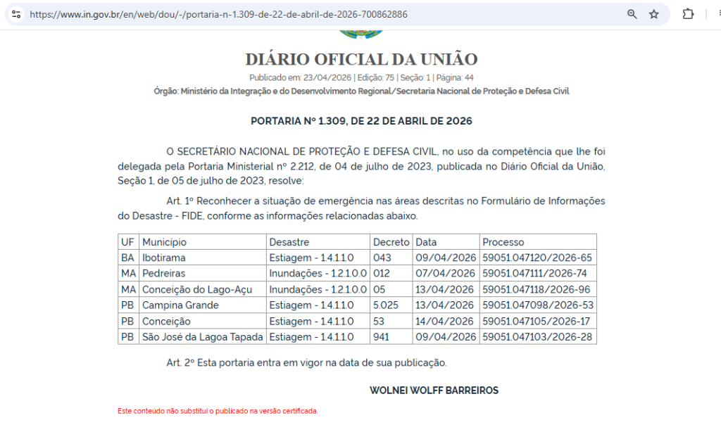 Em Campina Grande, o reconhecimento foi formalizado na portaria publicada no Diário Oficial da União em 13 de abril de 2026, em razão dos impactos da falta de chuvas que vêm atingindo o município. A cidade enfrenta dificuldades relacionadas ao abastecimento e aos efeitos prolongados da estiagem.