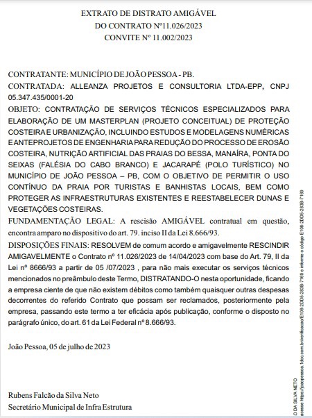 A prefeitura de João Pessoa, rescindiu de forma amigável o contrato com a empresa Alleanza Consultoria para o estudo de viabilidade de alargamento da orla. O anúncio do cancelamento foi divulgado no diário oficial desta terça-feira (11).