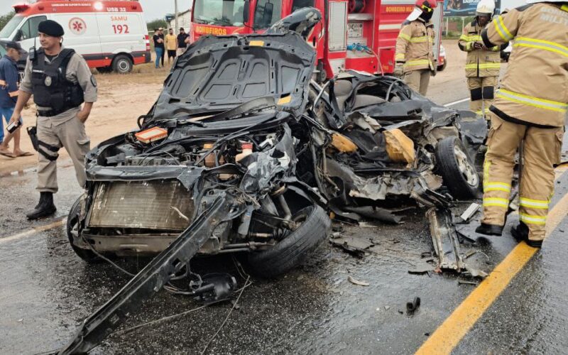 Na manhã deste sábado (22), um grave acidente foi registrado na BR-230, nas proximidades de Juazeirinho, Paraíba. A colisão frontal envolveu um carro e uma carreta, deixando o automóvel completamente destruído.