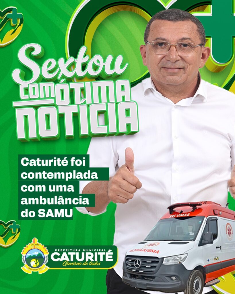 A Prefeitura de Caturité anunciou nesta sexta-feira (14) uma grande conquista. Graças à articulação do Prefeito Tita de Biu Domingos junto ao Ministério da Saúde, o município foi contemplado com uma nova ambulância para o Serviço de Atendimento Móvel de Urgência (SAMU).