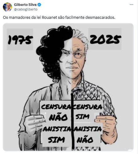 Na postagem, Cabo Gilberto compartilhou uma montagem com duas fotos de Caetano: uma de 1975, em que o artista defendia a anistia política durante a ditadura militar, e outra de 2025, quando se posicionou contra a anistia aos envolvidos nos atos golpistas.