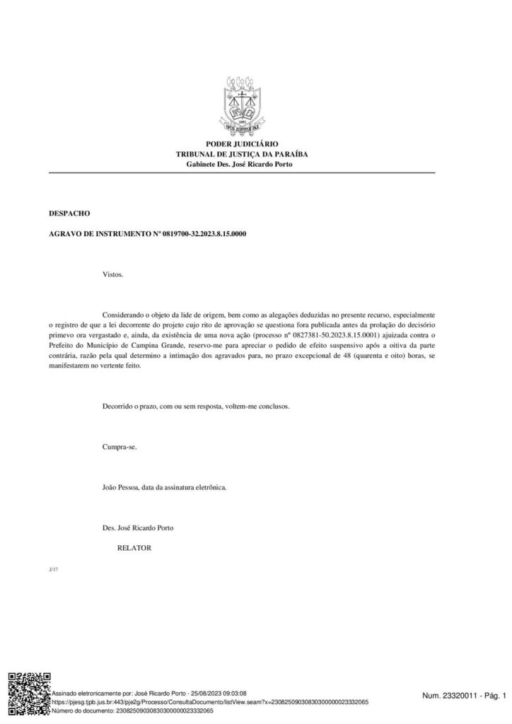 “Após ouvir a parte contrária, irei analisar o pedido de efeito suspensivo. Portanto, determino que os agravados se manifestem sobre o assunto em até 48 horas, em um despacho emitido pelo desembargador José Ricardo Porto”, informou.