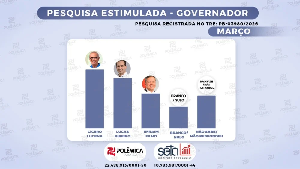 A pesquisa foi realizada entre os dias 26 e 28 de março, ouvindo 1.500 eleitores paraibanos, distribuídos em todas as regiões do estado, garantindo uma amostra representativa do eleitorado.