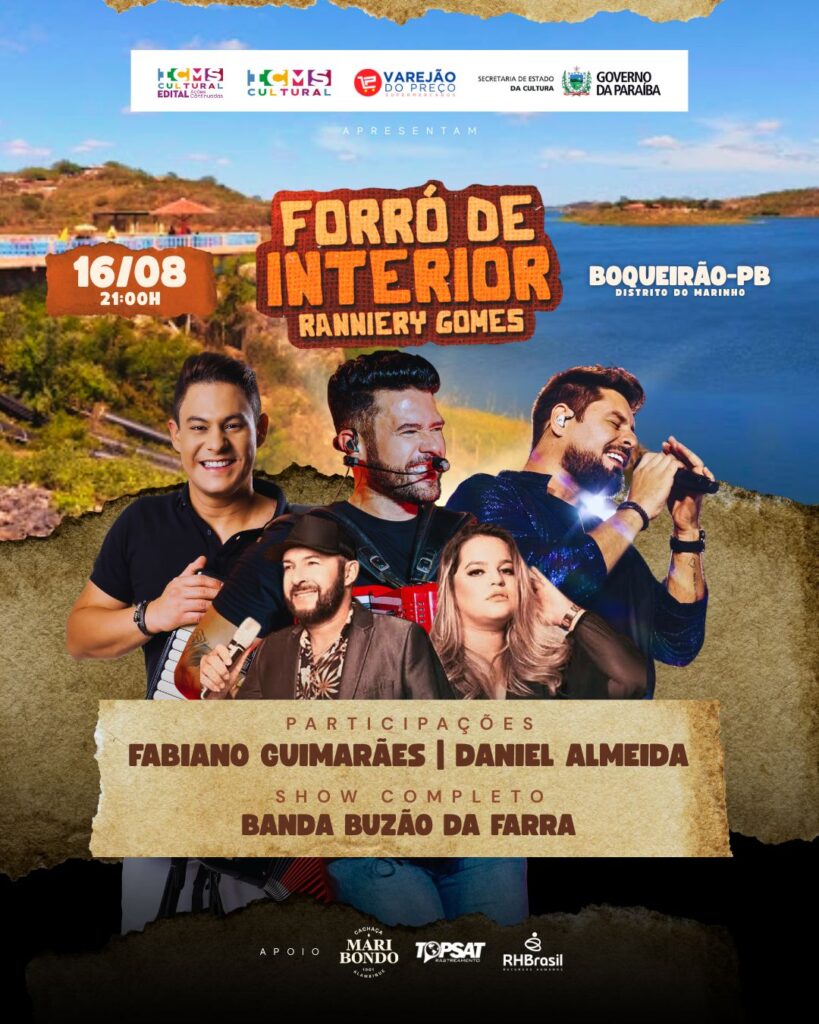 O Distrito do Marinho, em Boqueirão, será palco de uma grande noite de festa neste sábado (16), a partir das 21h, com a realização do Forró de Interior. O evento contará com show de Ranniery Gomes e participações especiais de Fabiano Guimarães e Daniel Almeida, além do show completo da banda Buzão da Farra.