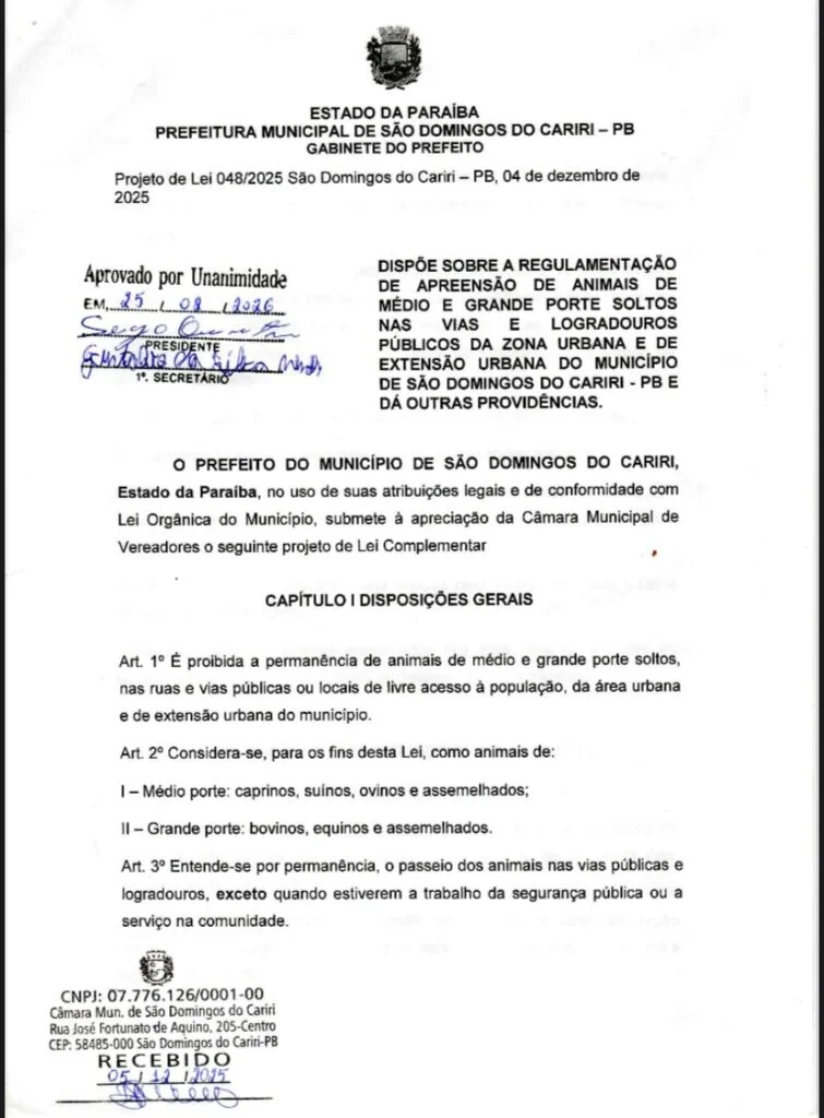 A Câmara Municipal de São Domingos do Cariri aprovou, por unanimidade, durante sessão ordinária realizada na tarde da última quarta-feira (25), o Projeto de Lei nº 048/2025, que proíbe a circulação de animais de médio e grande porte soltos em ruas e espaços públicos do município.