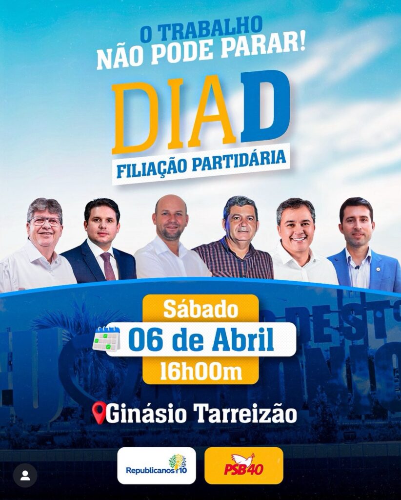 Neste sábado (6), acontece na cidade de Riacho de Santo Antônio, o Dia D de filiação partidária. O evento será no Ginásio Poliesportivo “Tarreizão”, às 16h.