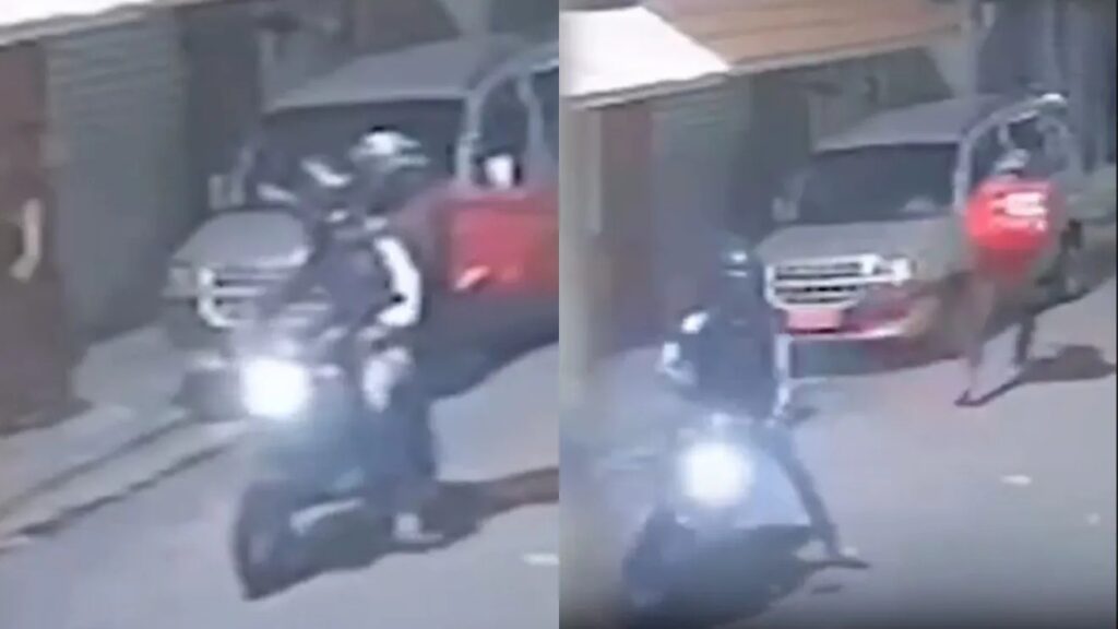 No registro de câmaras de segurança, é possível observar dois homens em uma moto se aproximando das vítimas. Logo na sequência, um deles, que usa uma bolsa de entregas vermelha, desce da moto com a arma na mão e aborda dois homens, que tentam fugir correndo, mas são alcançados pelos bandidos. Eles são o namorado e o pai de Beatriz Munhos, a jovem morta no latrocínio.