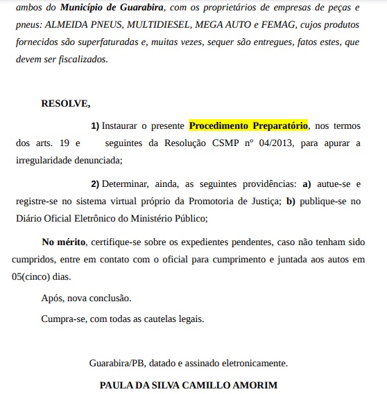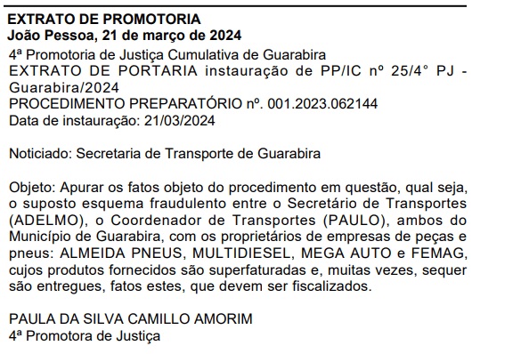 O Ministério Público abriu uma investigação para apurar uma denúncia de esquema fraudulento na compra de peças de veículos e pneus pela Prefeitura de Guarabira. O suposto esquema fraudulento envolve funcionários da Secretaria de Transportes da Prefeitura de Guarabira, com quatro empresários proprietários de empresas de peças automotivas e fornecimento de pneus.