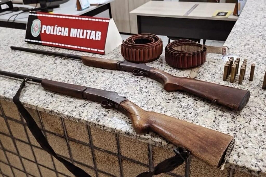 Com ele foram encontradas duas espingardas, uma de calibre 32, a outra de calibre 36, além de 29 munições.