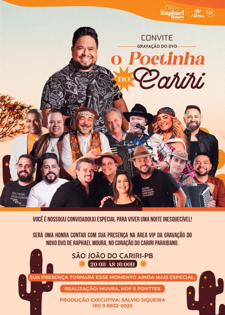 A cidade de São João do Cariri, conhecida como a “cidade mãe do Cariri”, será palco de um dos maiores eventos culturais da região neste dia 20 de agosto, às 16h. O cantor e compositor Raphael Moura, o Poetinha, realizará a gravação do seu novo DVD “O Poetinha no Cariri”, em um espetáculo totalmente gratuito e aberto ao público.
