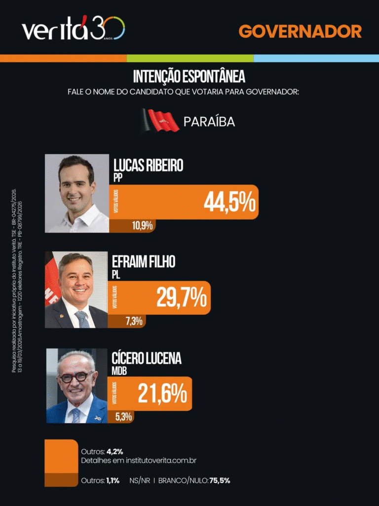 O governador da Paraíba, Lucas Ribeiro (PP), aparece em primeiro lugar, com 40,2% das intenções de voto, na disputa ao Governo da Paraíba nas Eleições de 2026. Dados são da pesquisa eleitoral do Instituto Veritá, divulgada na noite desta quarta-feira (8).