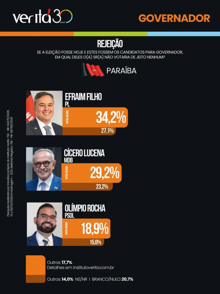 Em relação ao candidato em quem não votariam de jeito nenhum, 34,2% apontaram Efraim Filho, 29,2% disseram Cícero Lucena e 18,9% selecionou Olímpio Rocha (Psol).