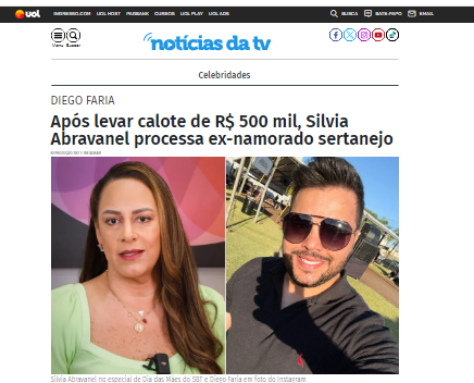 O portal Noticias da TV, vinculado ao UOL, trouxe, nesta semana a informação de que a apresentadora Silvia Abravanel, filha do apresentador Silvou Santos, precisou ir à Justiça para tentar recuperar mais de R$ 500 mil (meio milhão) que havia emprestado ao cantor sertanejo da Paraíba, Diego Faria, com quem teve um namoro.