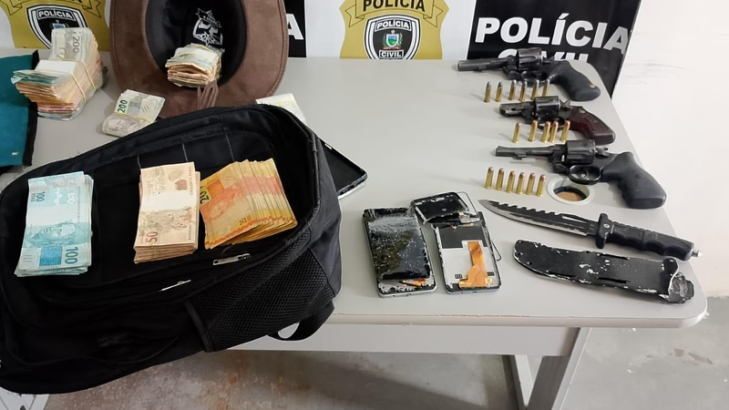 Após cercar o local e iniciar uma negociação, os dois suspeitos se renderam. O segurança foi libertado em segurança e os policiais apreenderam aproximadamente R$ 53 mil em espécie, além de três armas de fogo, uma delas pertencente ao vigilante.