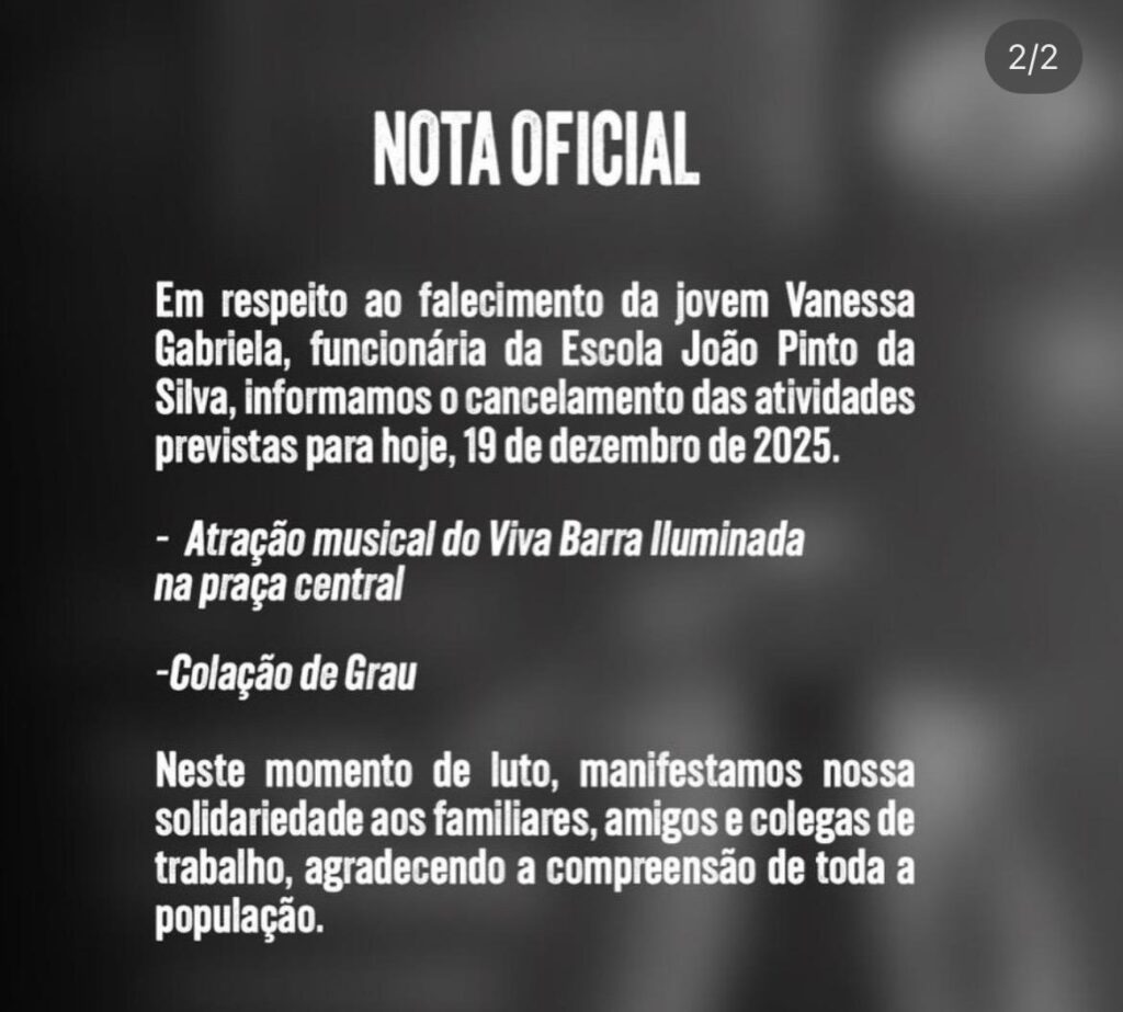 Diante do falecimento, a Prefeitura Municipal emitiu Nota Oficial informando o cancelamento das atividades previstas para esta quinta-feira, 19 de dezembro de 2025, em respeito ao luto vivido pela família, amigos e pela comunidade escolar. Foram canceladas: