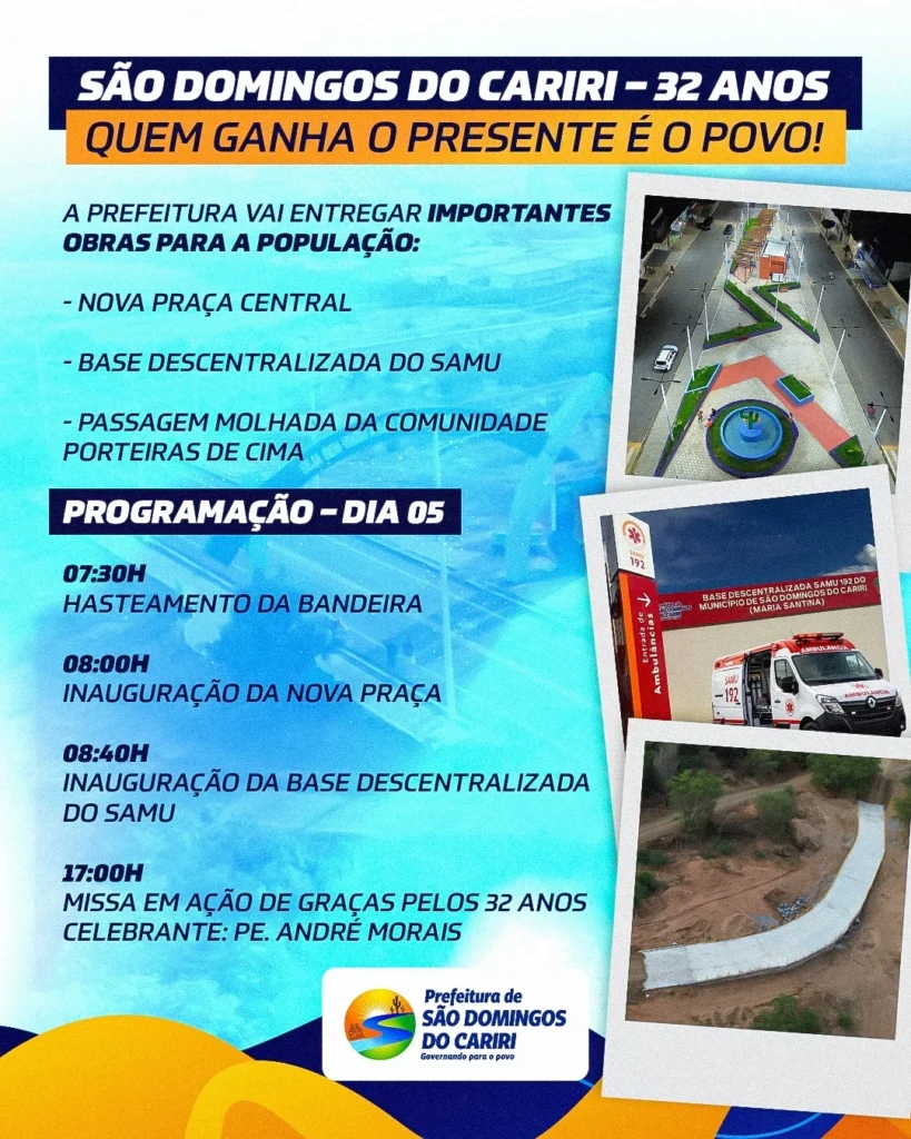 O prefeito Onildo Lindberg anunciou um pacote de importantes obras no 05 de Maio que serão entregues durante as comemorações dos 32 anos de emancipação política de São Domingos do Cariri.