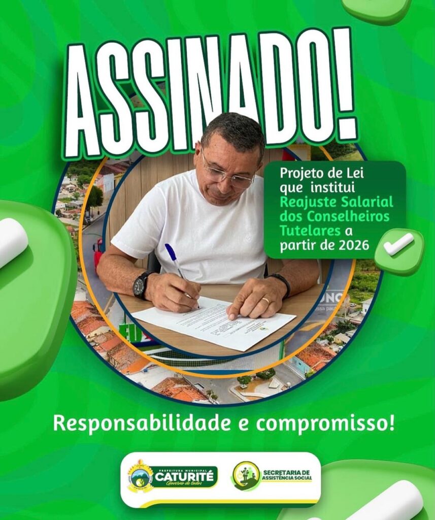 No dia dedicado a reconhecer o trabalho essencial dos conselheiros tutelares em todo o país, o prefeito de Caturité, Tita, reafirmou o compromisso da gestão municipal com a proteção integral de crianças e adolescentes. Em um ato simbólico e de grande importância para a categoria, o gestor assinou o Projeto de Lei que institui o reajuste salarial dos conselheiros tutelares a partir de 2026.