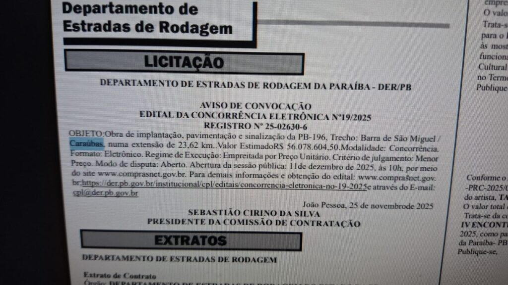O Cariri paraibano vive um momento histórico com o anúncio da licitação para a obra de implantação e pavimentação da PB-196, rodovia que finalmente conectará Caraúbas a Barra de São Miguel. O edital, publicado pelo Governo da Paraíba, prevê investimento superior a R$ 56 milhões em um trecho de mais de 23 km, representando um passo decisivo para transformar uma demanda aguardada há décadas em realidade.