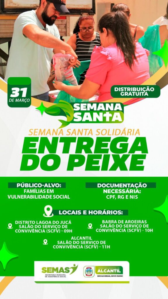 A Prefeitura de Alcantil, por meio da Secretaria Municipal de Assistência Social (SEMAS), realizará no próximo dia 31 de março a tradicional entrega de peixe durante a Semana Santa. A ação é voltada para famílias em situação de vulnerabilidade social e reforça o compromisso da gestão com a solidariedade e o cuidado com a população.