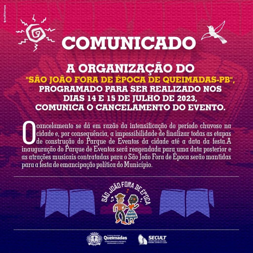 A Prefeitura de Queimadas, divulgou nesta quinta-feira, 29 de junho, um nota que informa o cancelamento do evento “São João Fora de Época” que iria acontecer nos dias 14 e 15 de julho.