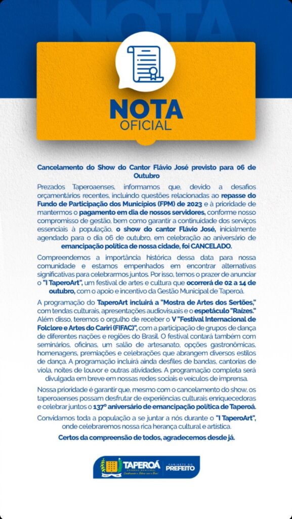 A Prefeitura Municipal de Taperoá divulgou uma nota oficial, nesta quinta-feira (21), para informar que, devido a desafios orçamentários recentes, incluindo questões relacionadas ao repasse do FPM (Fundo de Participação dos Municípios) e à necessidade prioritária de garantir a estabilidade financeira da Prefeitura Municipal de Taperoá, o aguardado show do cantor Flávio José, inicialmente programado para o dia 6 de outubro, foi lamentavelmente CANCELADO.