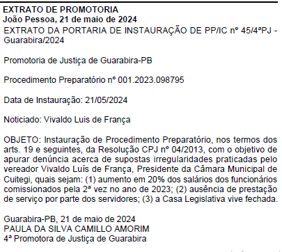 A promotora de Justiça, Paula da Silva Camillo Amorim, determinou a instauração do Procedimento Preparatório nº 001.2023.098795 para investigar denúncias contra Vivaldo Luís de França, presidente da Câmara Municipal de Cuitegi.