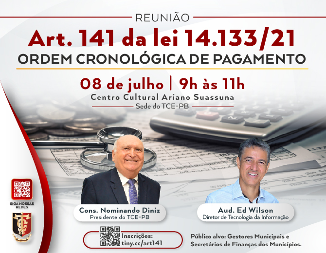 O presidente do Tribunal de Contas do Estado da Paraíba (TCE-PB), conselheiro Nominando Diniz, convoca gestores públicos e secretários de finanças dos municípios para uma reunião na sede do TCE-PB. O encontro tem como objetivo discutir o Art. 141 da Lei 14.133/2021, que trata de pagamento pela administração observada a ordem cronológica para cada fonte diferenciada de recursos, subdividida nas seguintes categorias de contratos: fornecimento de bens; locações; prestação de serviços; e realização de obras. Lei de Licitações e Contratos Administrativos