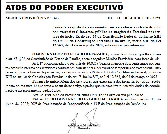 Além disso, o reajuste também é aplicável aos professores que desempenham funções de coordenação e assessoramento pedagógico. O texto da MP é assinado pelo governador João Azevêdo (PSB).