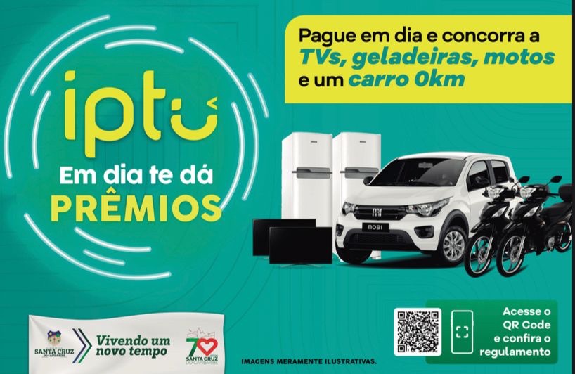 A Prefeitura de Santa Cruz do Capibaribe, lançou recentemente o programa IPTU em Dia da Prêmios, uma ação do governo que irá premiar os cidadãos que estiverem com seu IPTU em dias. Os populares vão concorrer a 1 automóvel 0km, 2 motocicletas 0km, 2 geladeiras e 2 TV’S em LED.