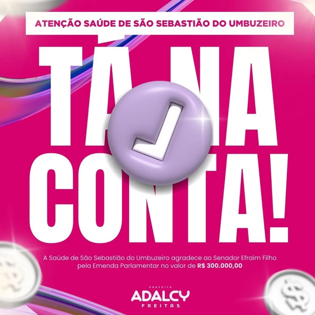 A prefeita de São Sebastião do Umbuzeiro, Adalcy Freitas, anunciou com entusiasmo a chegada de um novo recurso que será destinado à saúde do município. O senador Efraim Filho confirmou o envio de R$ 300 mil, valor que será investido diretamente na melhoria dos serviços prestados à população.