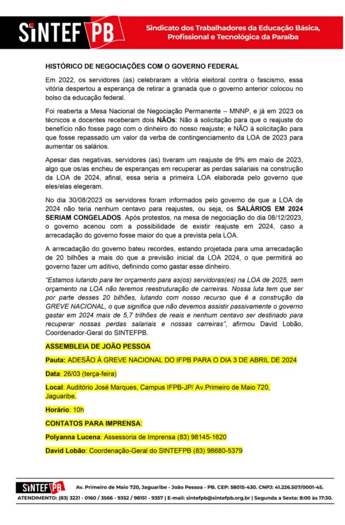Na próxima terça-feira (26), servidores do Instituto Federal de Ciência e Tecnologia da Paraíba, farão uma assembleia para decidir sobre a adesão de uma greve geral nos polos. Até o momento sete campi do Estado já aprovaram a greve geral, são eles: Picuí, Patos, Guarabira, Sousa, Cajazeiras, Campina Grande e Monteiro. O polo de João Pessoa, sendo o maior do Estado, é determinante na aprovação e continuidade da greve.