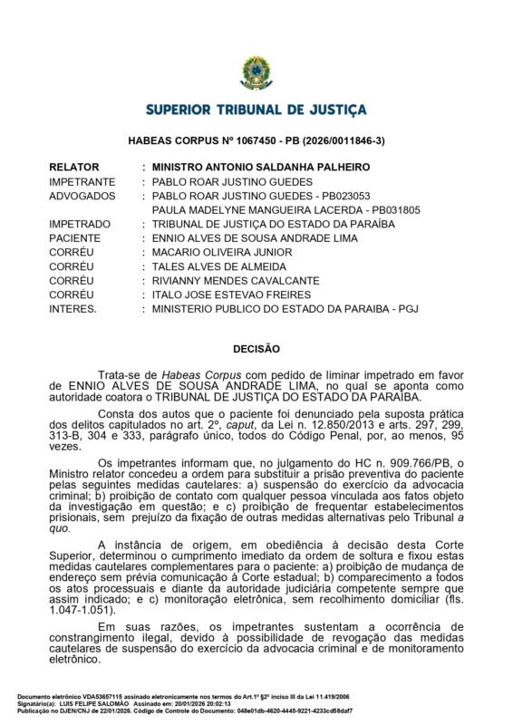 O Superior Tribunal de Justiça (STJ) negou pedido de liminar e manteve as medidas cautelares impostas a um advogado acusado de fraudes para beneficiar presos na Paraíba. A decisão foi tomada pelo vice-presidente do STJ, ministro Luís Felipe Salomão, no exercício da presidência. O advogado é acusado de cometer crimes por, pelo menos, 95 vezes – entres eles, falsidade ideológica e corrupção ativa.