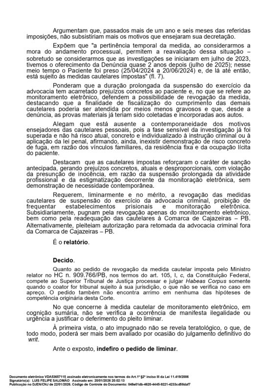 Com base nesses argumentos, a defesa requereu ao STJ, liminarmente e no mérito, a revogação das medidas cautelares. Subsidiariamente, solicitou a retirada apenas do monitoramento eletrônico e a limitação das outras cautelares à comarca de Cajazeiras.