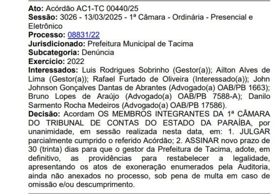 O Tribunal recebeu uma denúncia trazendo referências a supostas práticas de nepotismo atribuídas ao Prefeito de Tacima, Luís Rodrigues Sobrinho e, ao Presidente da Câmara Municipal, Ailton Alves de Lima, por terem nomeado parentes para cargos na Prefeitura e na Câmara. Os fatos denunciados abrangem o exercício de 2022.