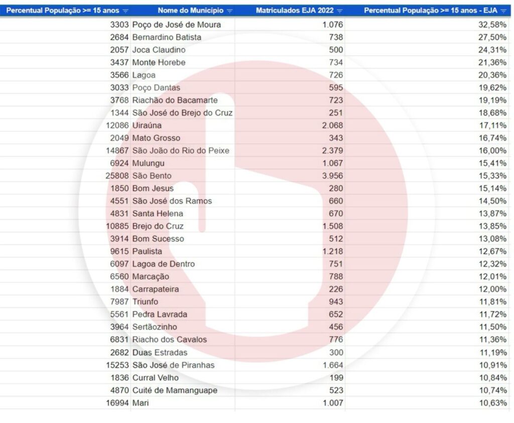 Fernando Catão, cita como exemplo, o município de Poço Dantas, com 3.303 habitantes acima dos 15 anos de idade, faixa etária em que se encaixa no perfil do EJA. E desse número apenas 1.076 estariam matriculados, números que chamaram a atenção do conselheiro. Outra cidade, citada foi Bernardino Batista, com 2.684 habitantes com faixa etária acima dos 15 anos e 738 delas, o que representa 27,50% estaria matriculado no programa.