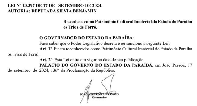 A lei que torna os trios de forró como Patrimônio Imaterial é de autoria da deputada Silvia Benjamim (Republicanos) e foi sancionada pelo governador João Azevêdo (PSB).